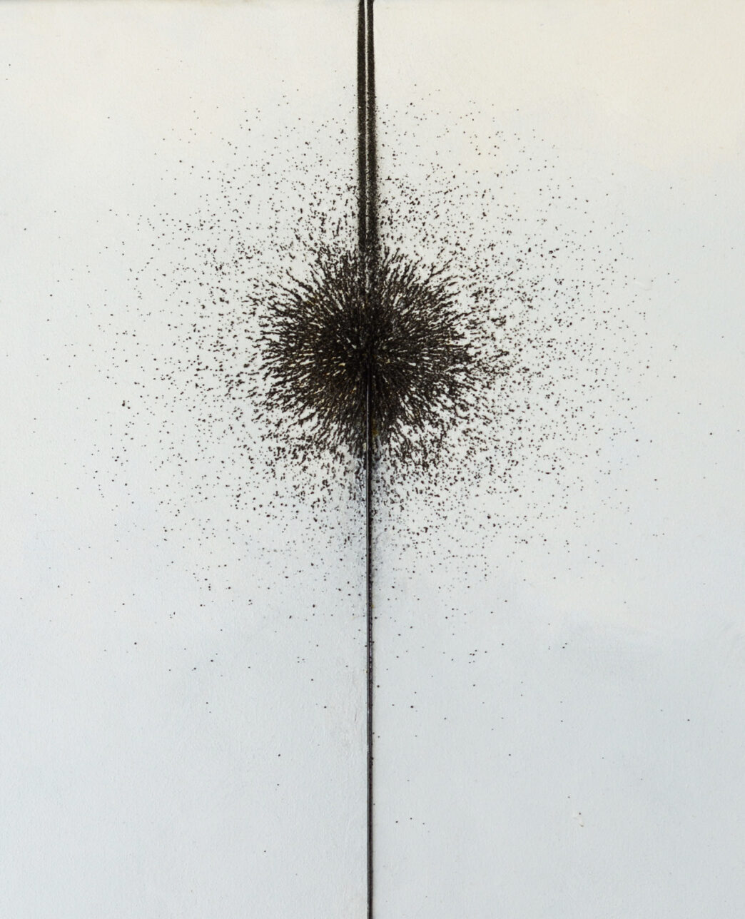 Through acrylic, glaze, spray paint, iron shavings, wire, and manipulated surfaces, the series builds spatial relationships that suggest simultaneity, expansion, and collapse. Instead of illustrating theory literally, these works use abstraction to propose dimension as something felt through depth, fragmentation, and shifting visual logic.