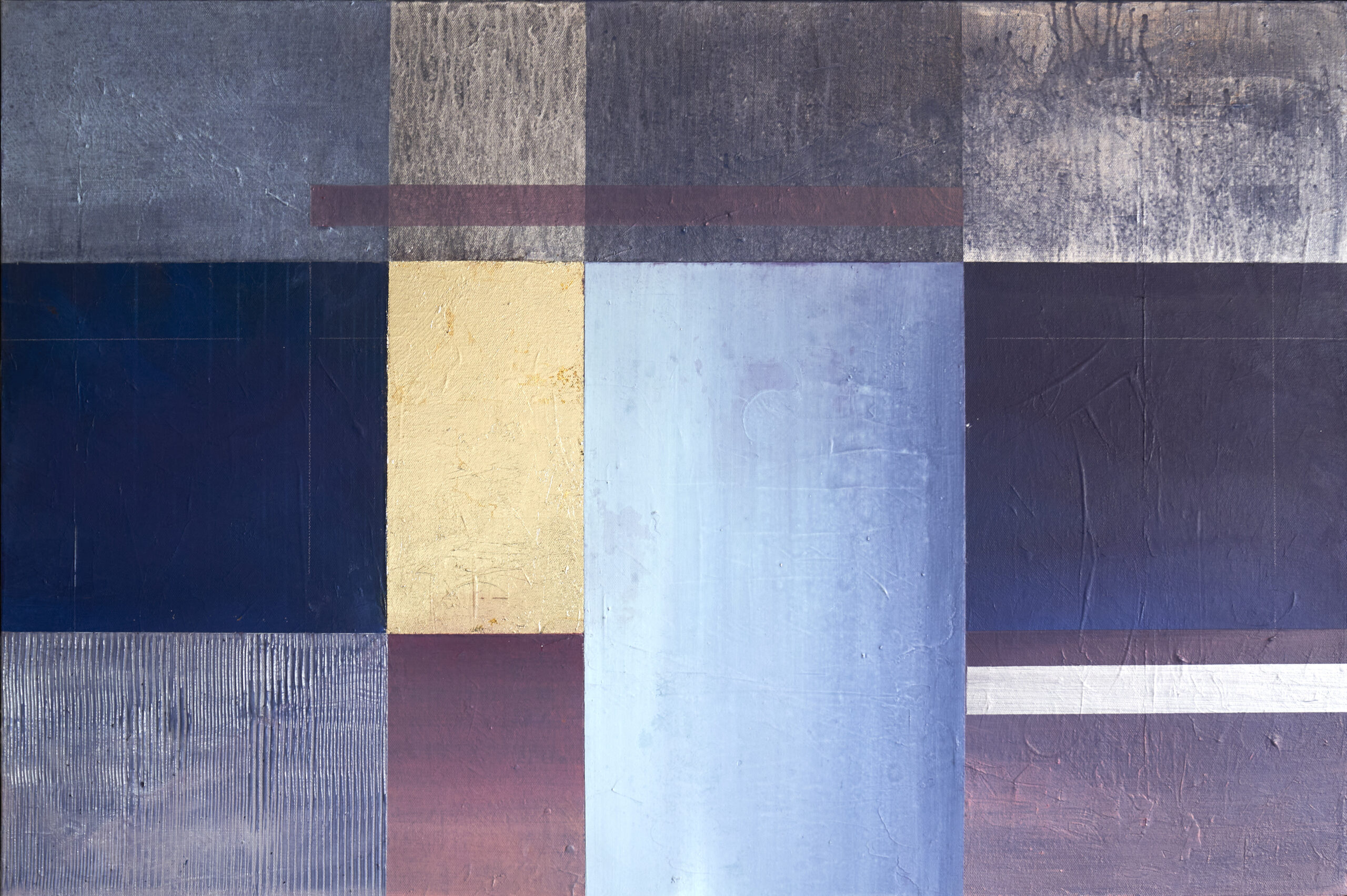 Beginning with guide lines, measured divisions, and underlying frameworks, the works are gradually interrupted through gesture, weathering, oxidation, and sediment-like buildup. Materials such as acrylic, graphite, gold leaf, and iron shavings introduce instability and change, allowing each surface to carry both intention and unpredictability.